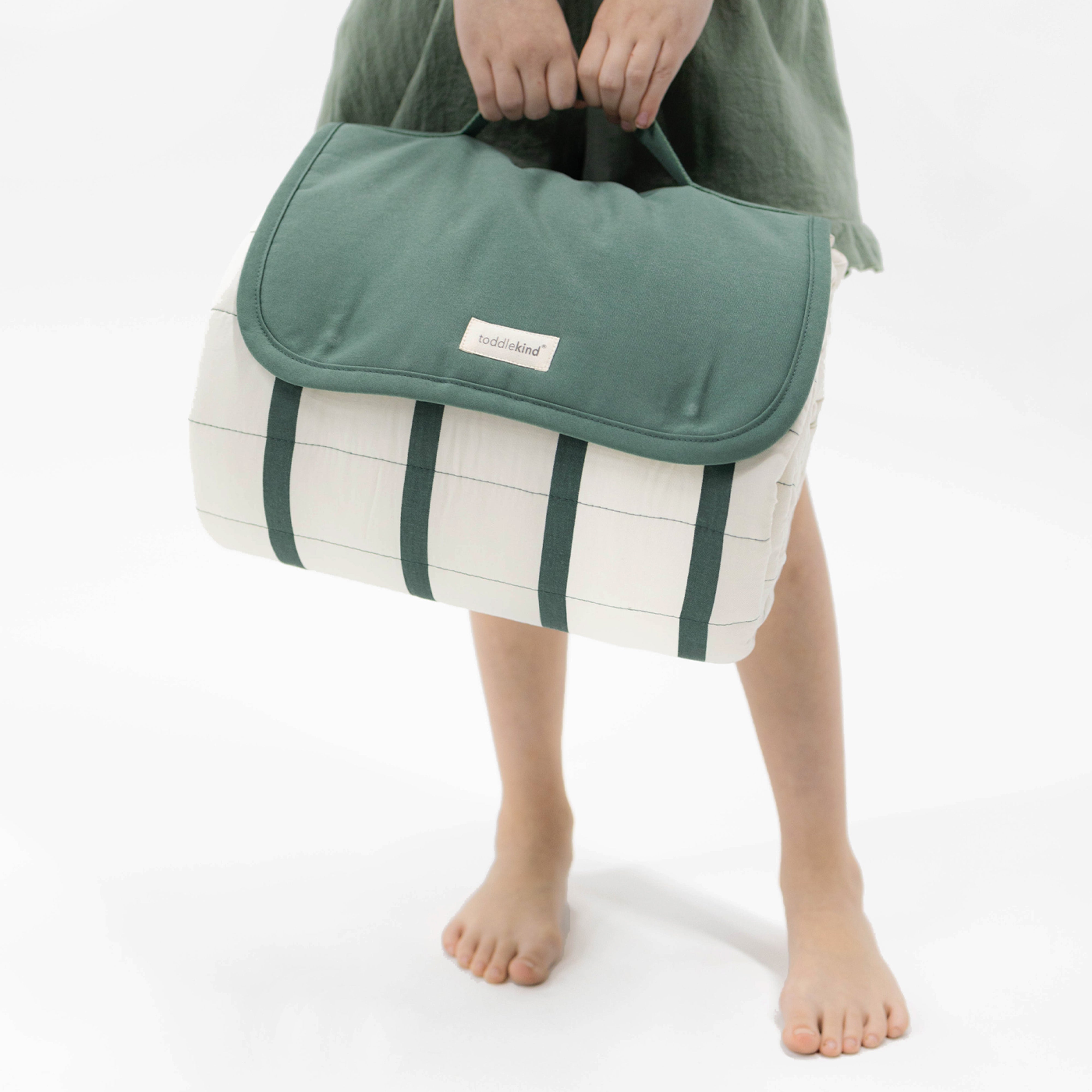 The quilted organic cotton top is soft and breathable, while the water-resistant coating and anti-slip backing keep it functional and family-ready. It folds easily and includes a carry handle for grab-and-go convenience.