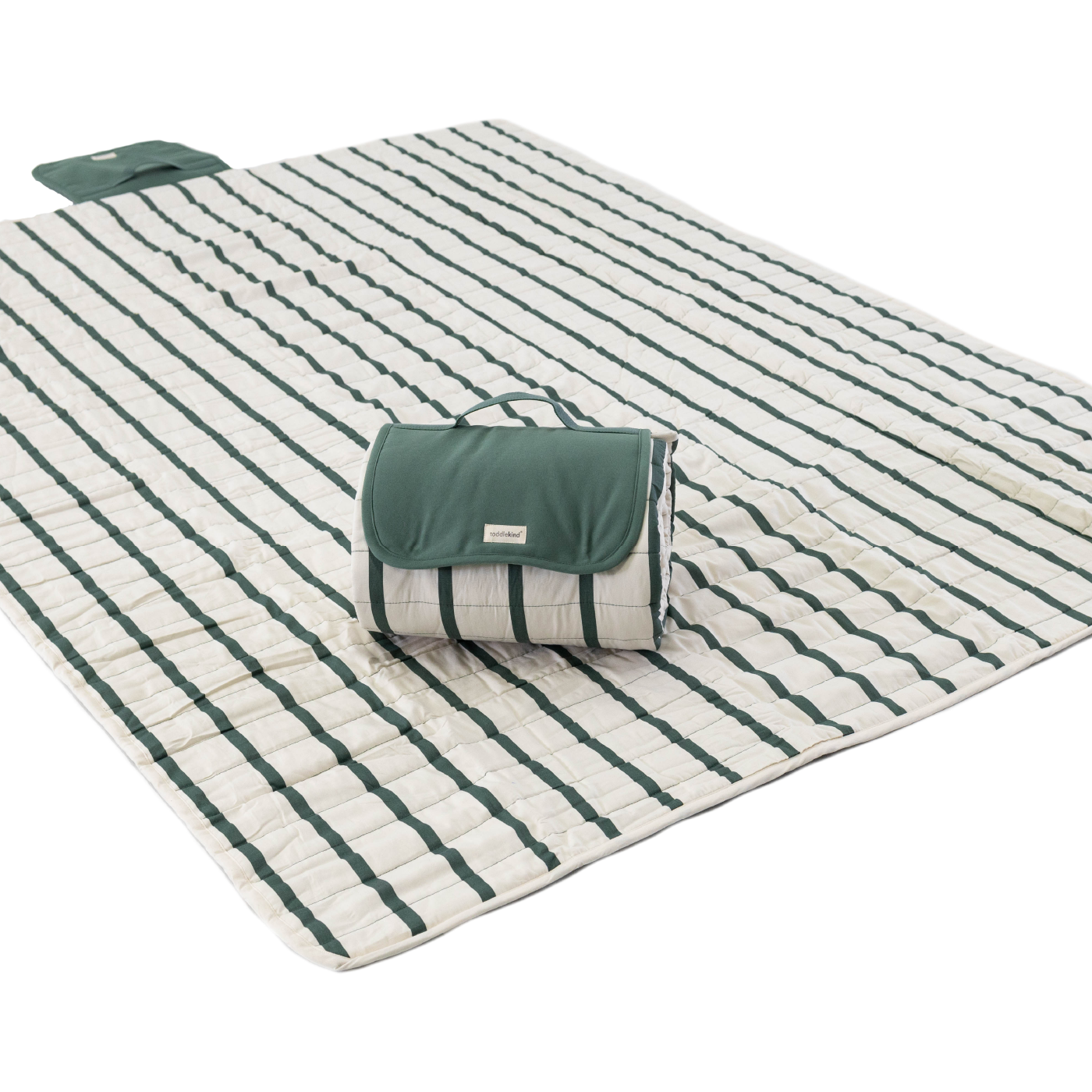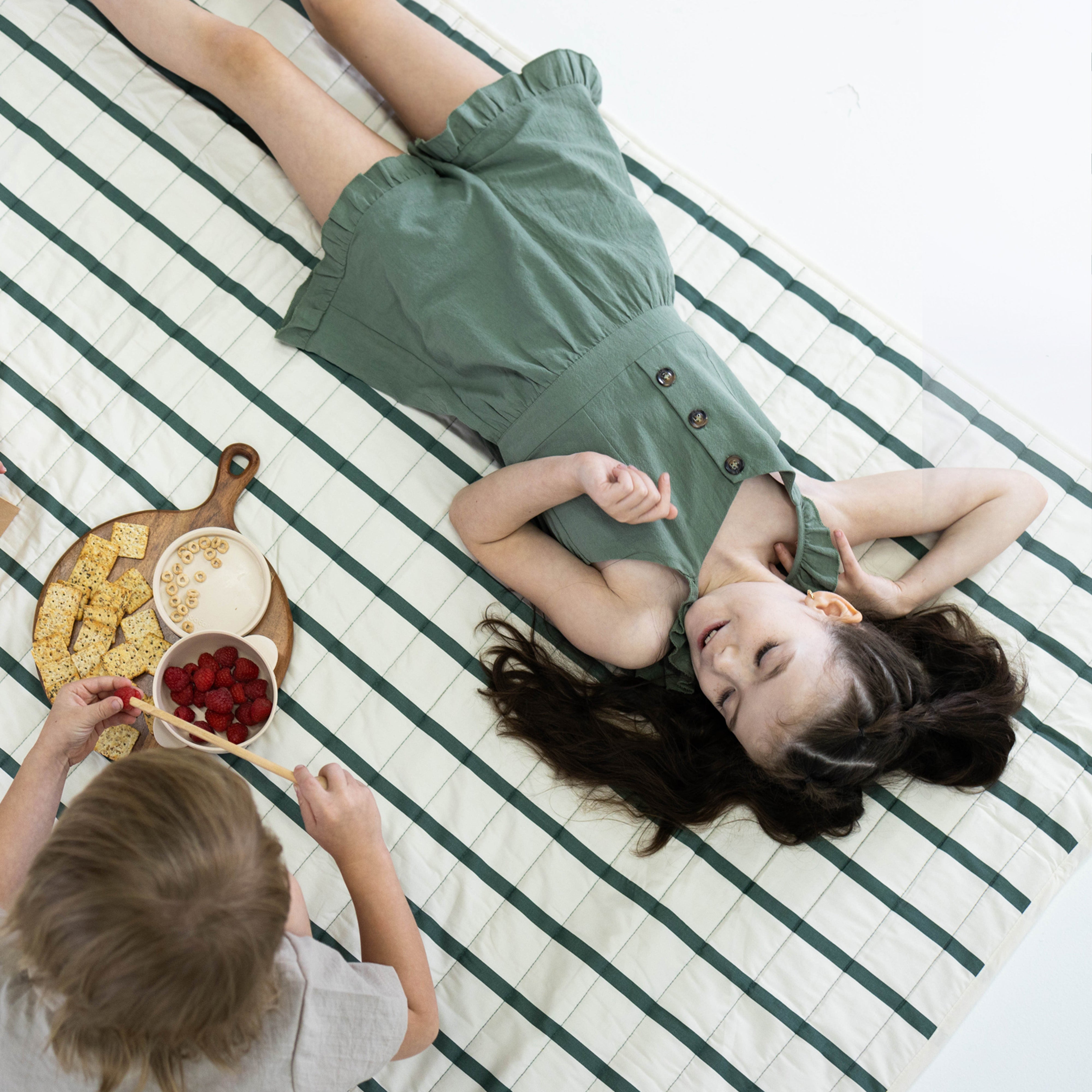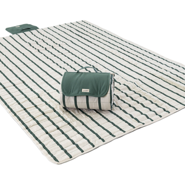 Featuring reversible designs, this item boasts forest green stripes on an off-white organic cotton top, with a durable solid forest green polyester underside.