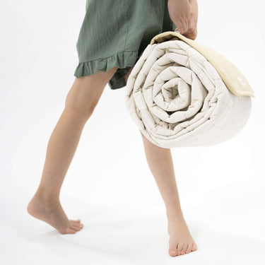 The quilted organic cotton top is soft and breathable, while the water-resistant coating and anti-slip backing keep it functional and family-ready. It folds easily and includes a carry handle for grab-and-go convenience.